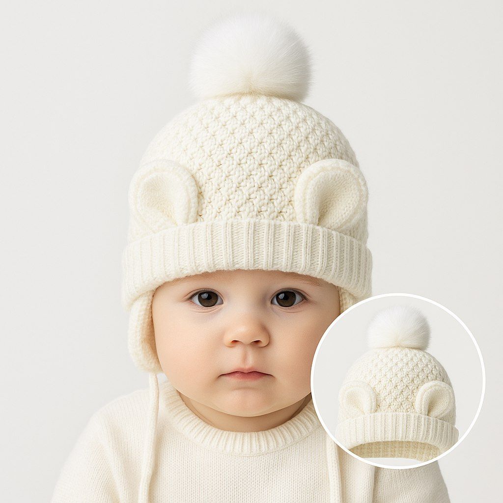 Модель: зимняя или прохладная осень/весна детская шапочка на завязках, с объёмным белым помпоном.