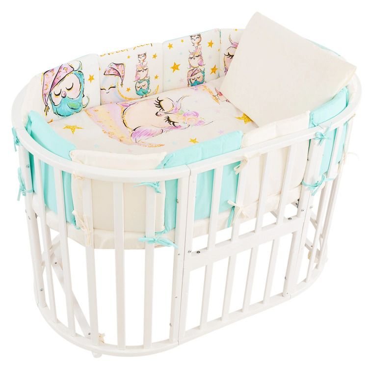 Состав комплекта: пододеяльник, простыня, наволочка, одеяло, подушка, бортики-подушечки 12 шт.