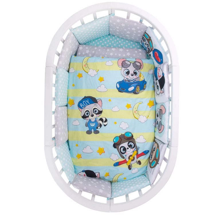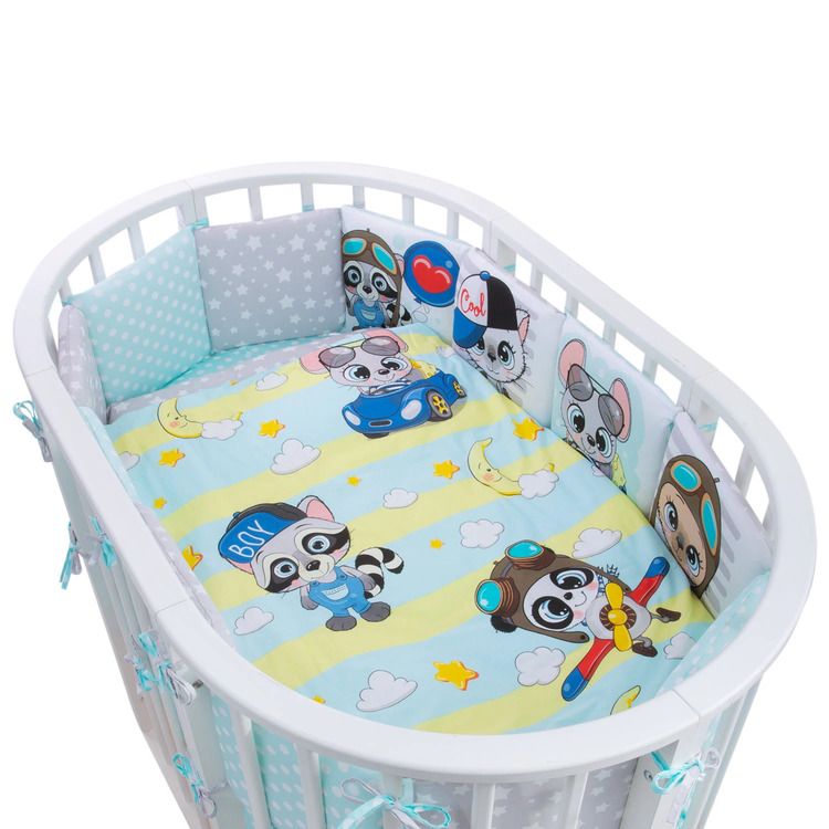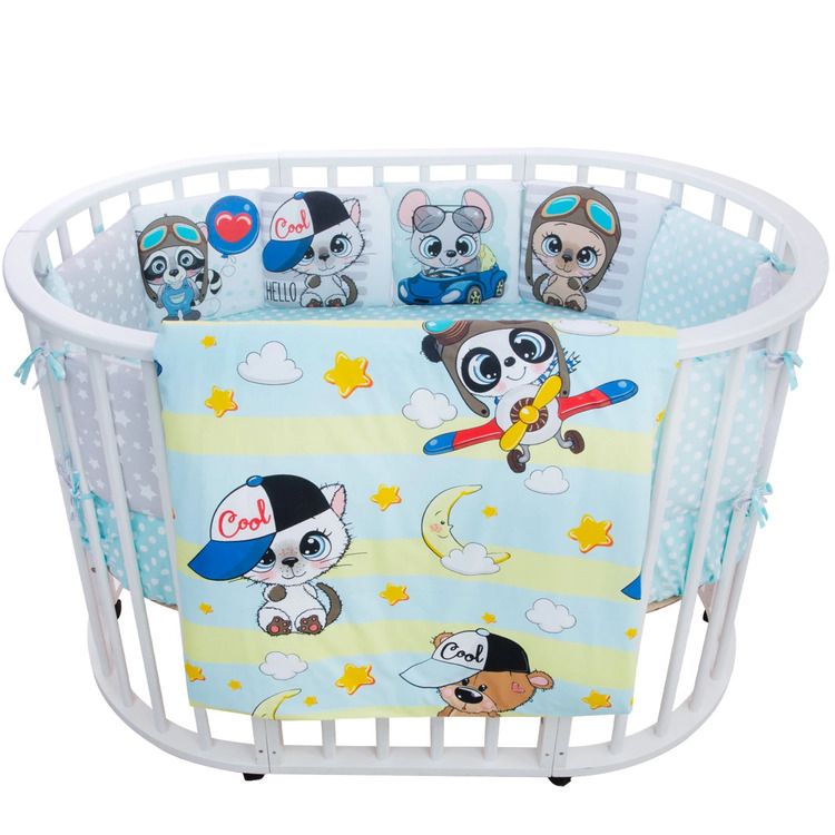 Состав комплекта: пододеяльник, простыня, наволочка, одеяло, подушка, бортики-подушечки 12 шт.Материал: перкаль (высококачественный хлопок)